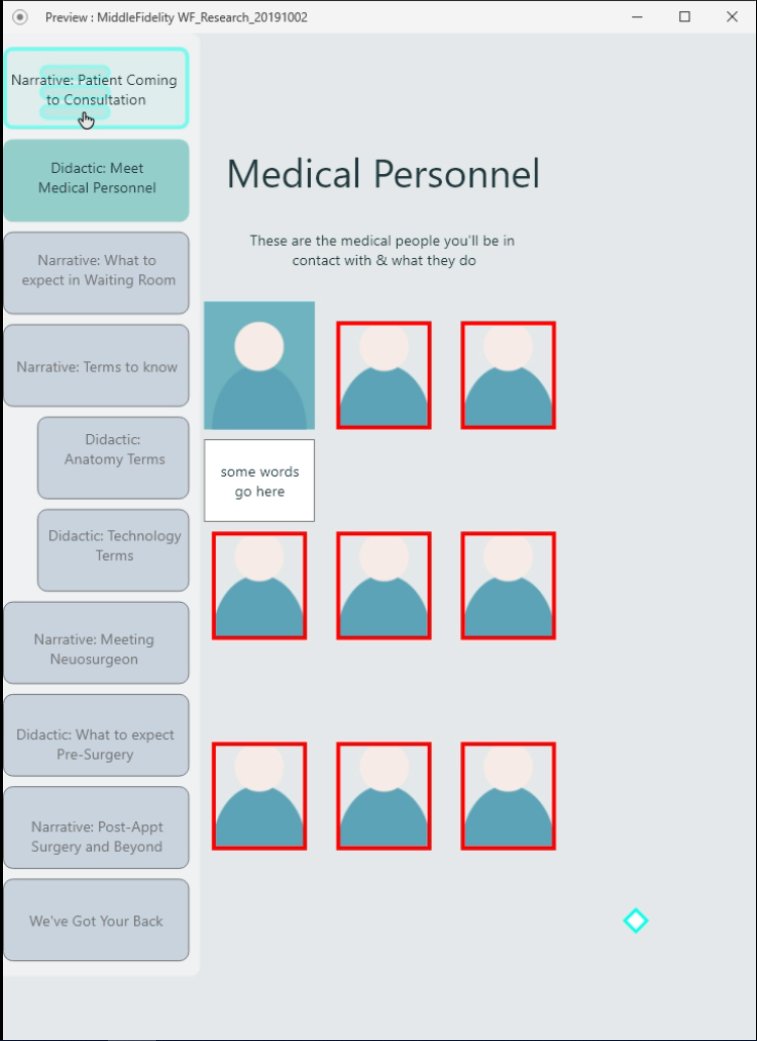 This project will explore how to design a tablet-based interactive application for neurosurgery patients by (1) incorporating feedback from neurosurgery patients to influence UX/UI design, breadth and depth of content, (2) consulting neurosurgeons and nurses on content, and (3) applying accessibility standards to the application.